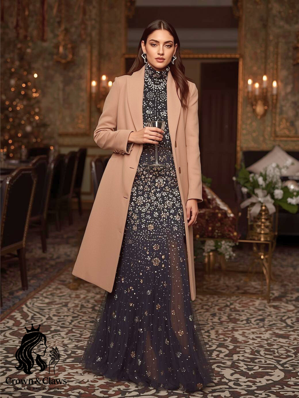6. Champagne Sparkle Column Dress with Camel Long Coat