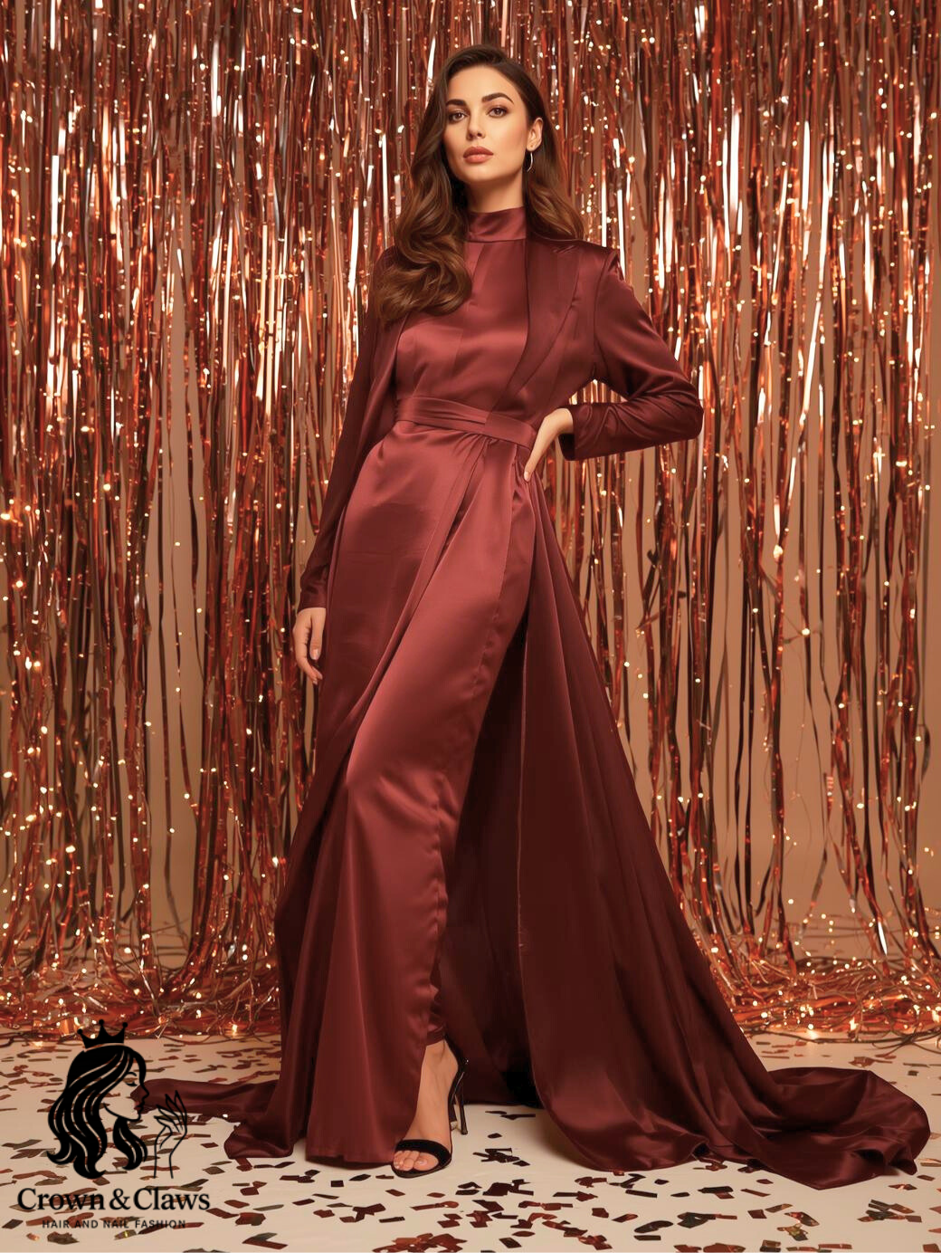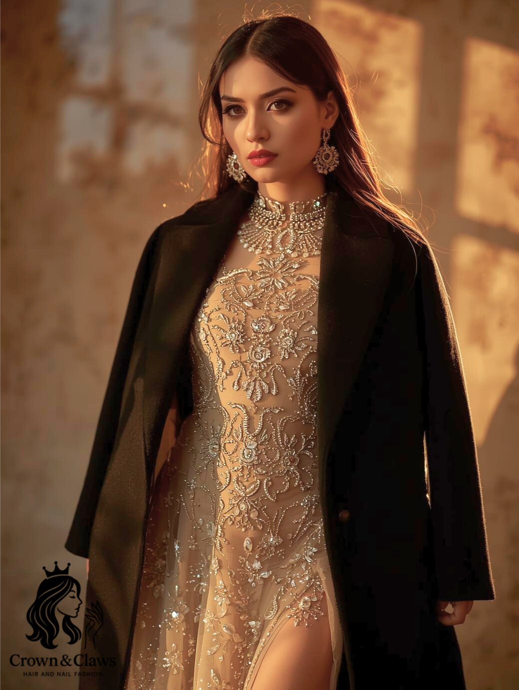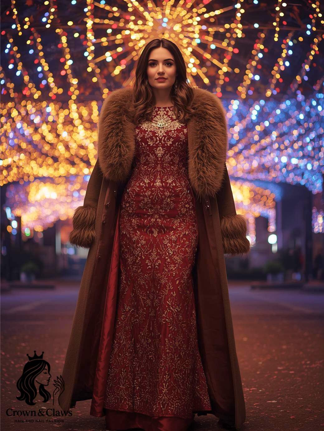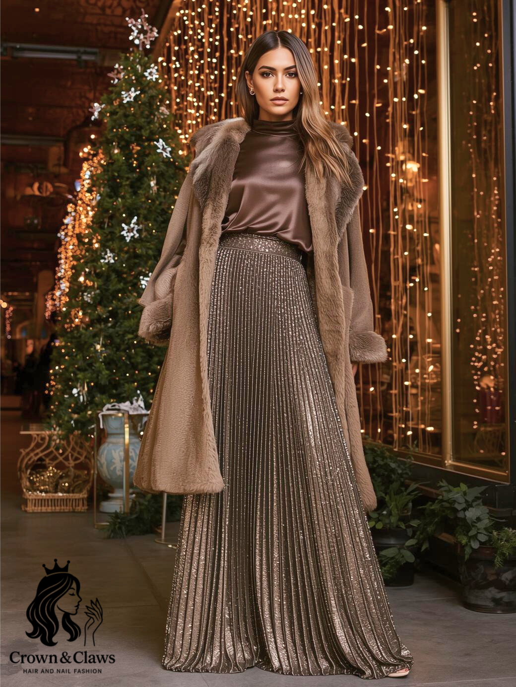 This NYE outfit is perfect for women who want a regal, romantic, and winter-luxury style for celebrations. It’s ideal for elegant dinners, ballroom events, or sophisticated countdown parties where breathtaking detail and warm seasonal textures truly stand out.