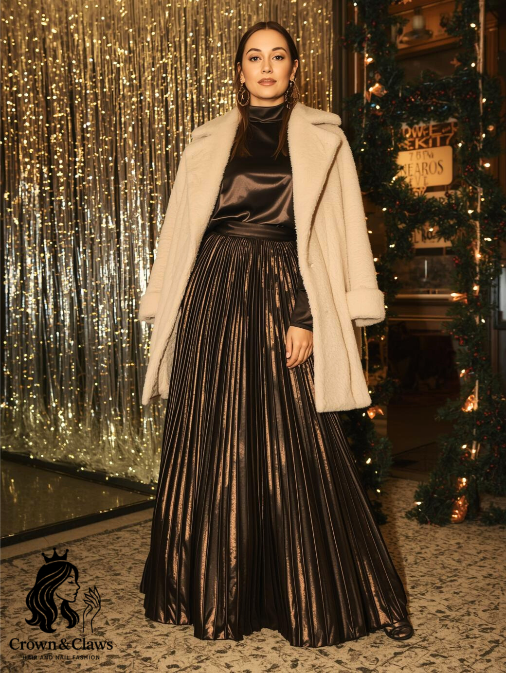 16. Satin Black High-Neck Top with Bronze Pleated Maxi Skirt and Cream Coat