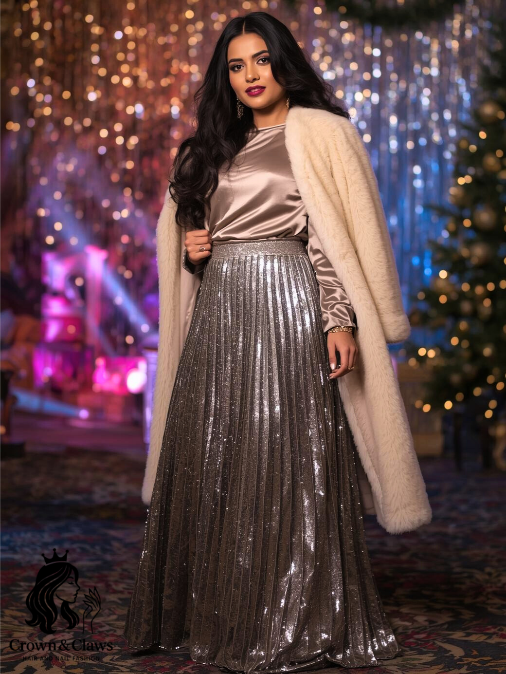 To elevate this outfit further, pair it with silver heels or strappy metallic sandals. Keep jewelry subtle since the sequins already provide high visual impact. A textured winter wrap or faux-fur stole adds both warmth and a luxurious touch to the evening look.