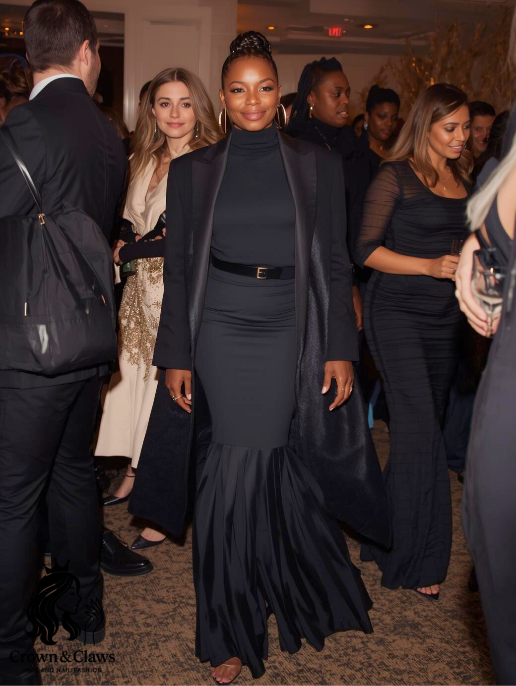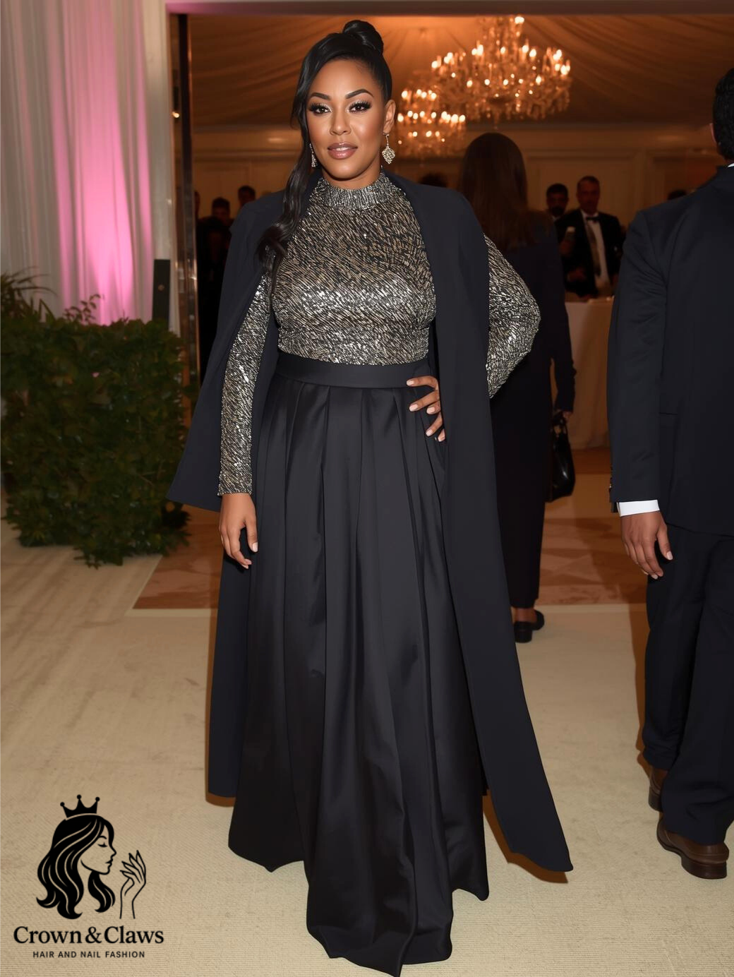 To elevate the look, style it with classic black heels and silver jewelry for a contrasting effect. A sleek hairstyle will allow the gown’s detailing to remain the focal point. For winter warmth, consider pairing it with a long black coat or faux-fur wrap that maintains the outfit’s upscale vibe.