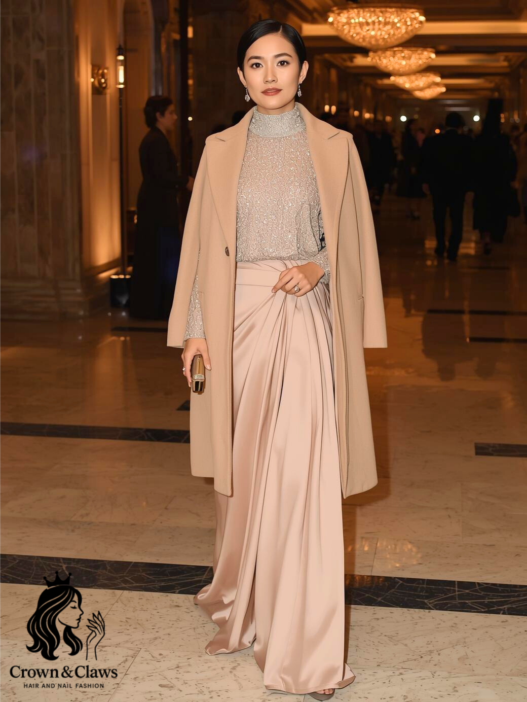To elevate the look further, pair the satin dress with strappy heels or pointed pumps for added poise. A statement necklace or bold earrings can introduce the right amount of sparkle without disturbing the minimalist charm of the outfit. A long tailored coat adds both warmth and refinement for winter events while keeping the outfit striking from head to toe.