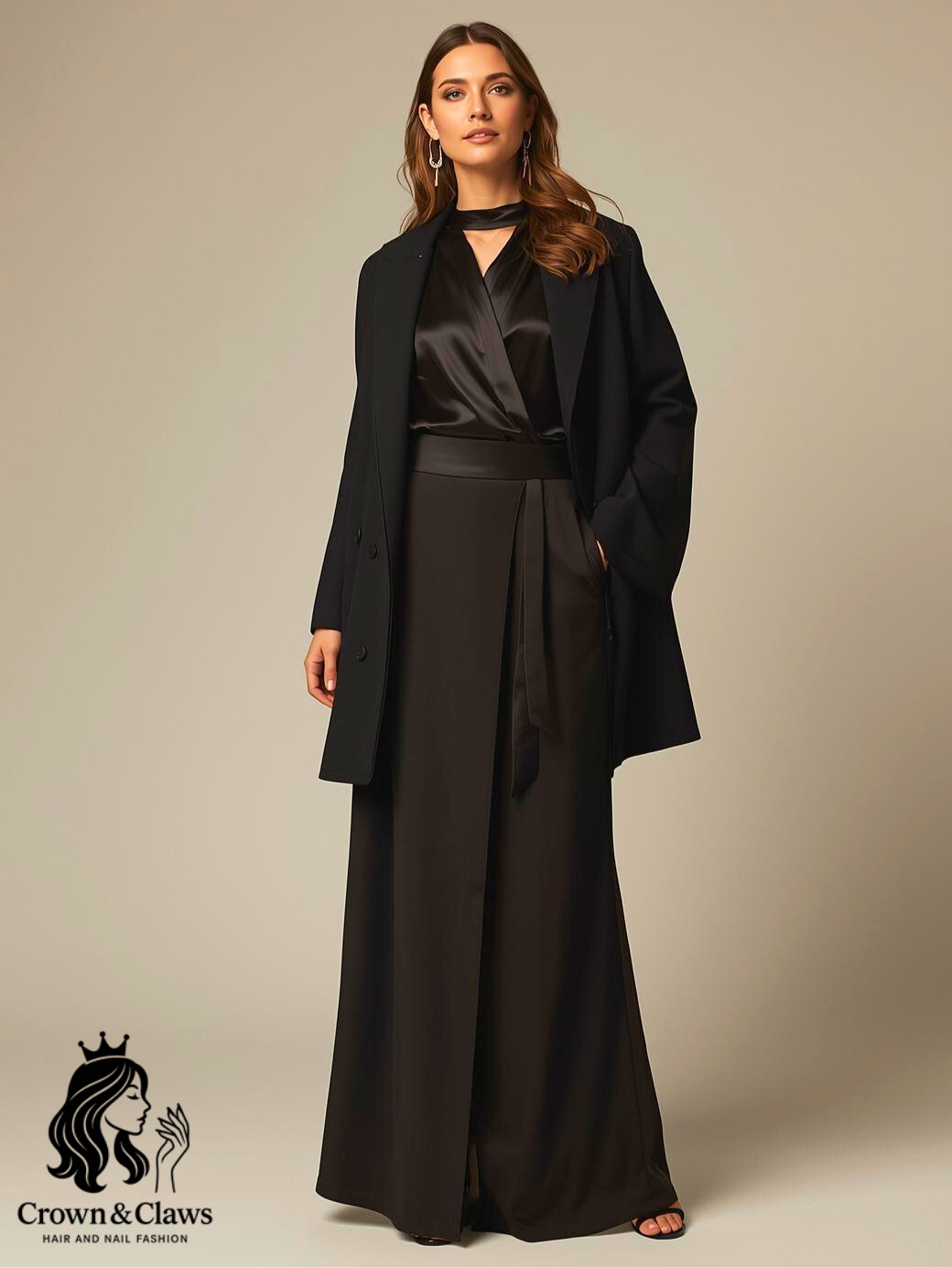 20. Black Satin Wrap Top with Wide-Leg Palazzo Trousers and Long Coat