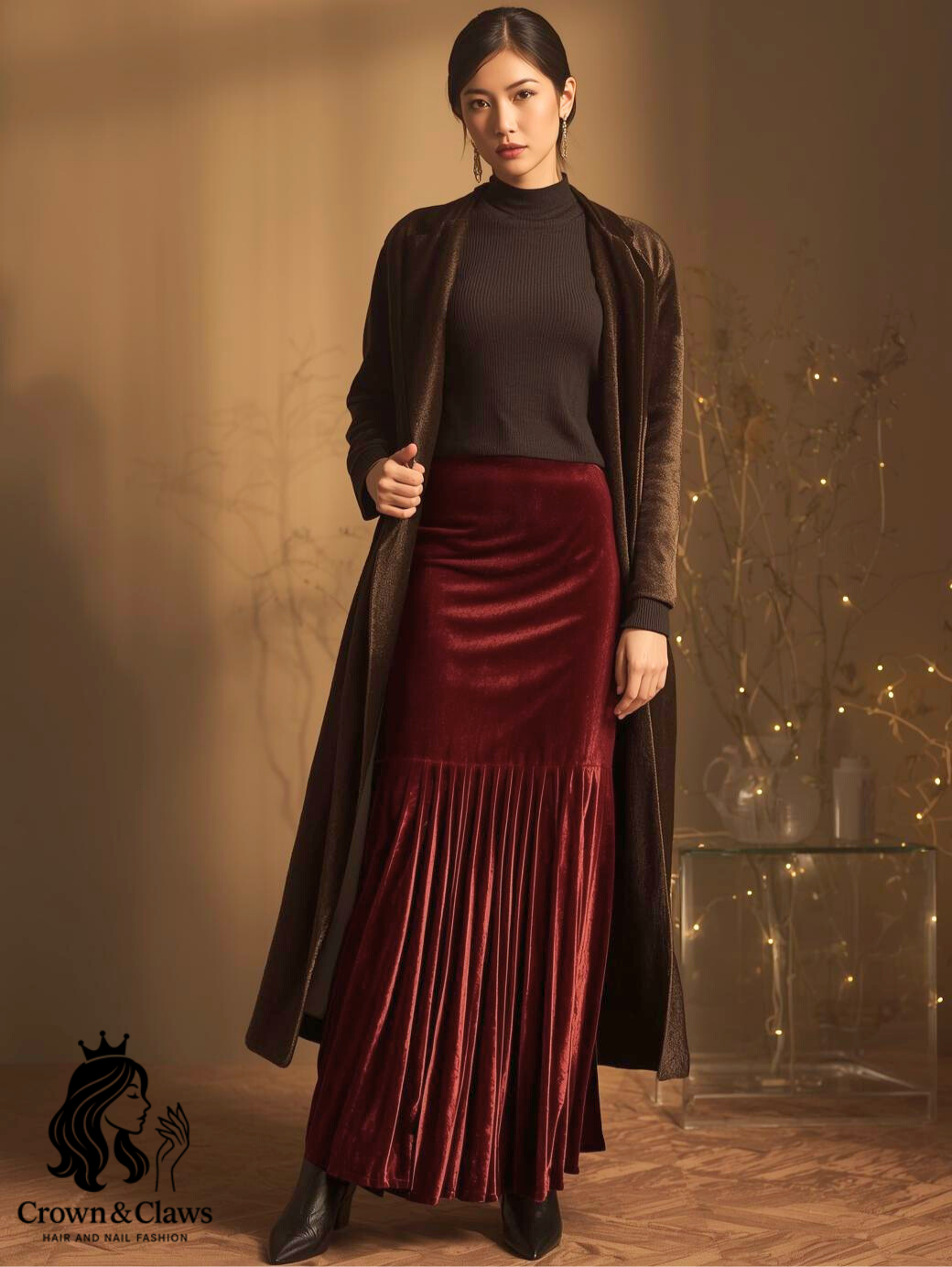 26. Black Ribbed Top with Burgundy Velvet Pleated Maxi Skirt and Long Coat