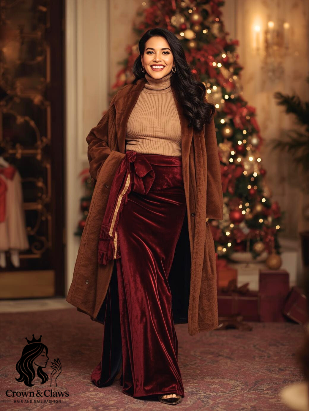 To elevate this look, pair it with champagne-toned or gold accessories that complement the warmth of the velvet. Soft jewelry, minimal heels, and a defined lip color amplify the outfit’s elegance. A tailored winter coat or faux-fur wrap can add cozy refinement.