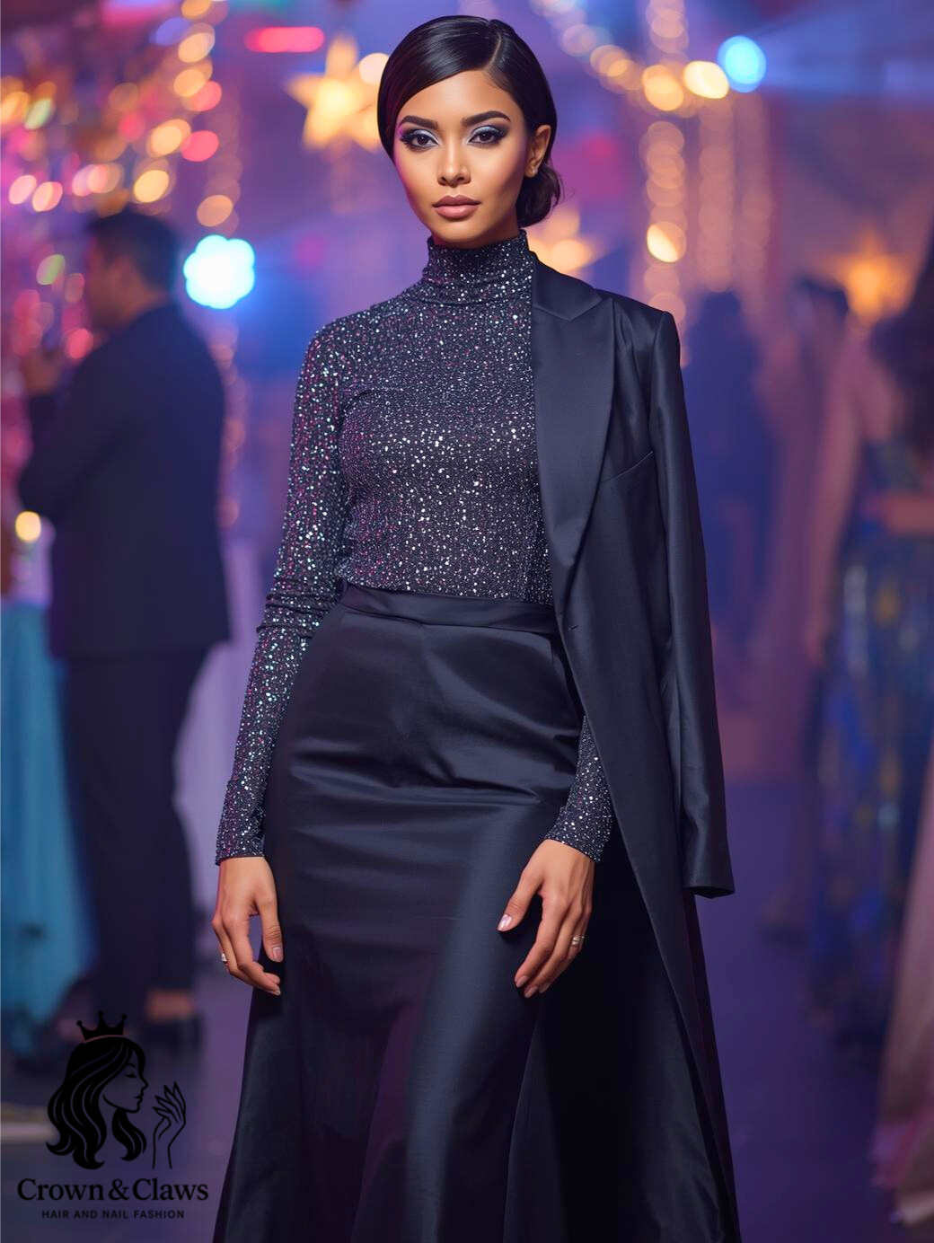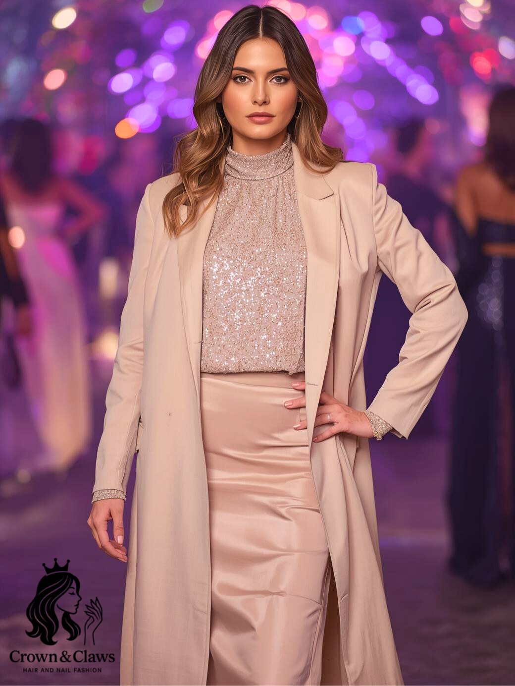 This look is perfect for women who love standout sparkle and want a glamorous entrance into the New Year. It works beautifully for club nights, rooftop celebrations, and any NYE gathering with dancing and bright lights.