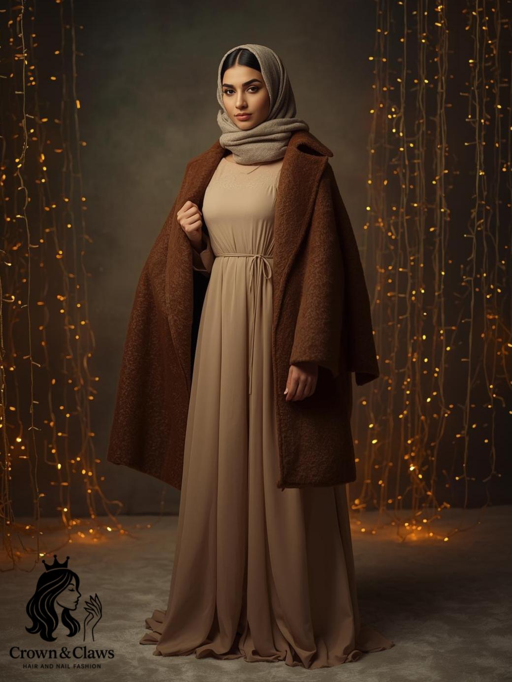 30. Hijab-Friendly Neutral Maxi Dress with Warm Brown Winter Coat