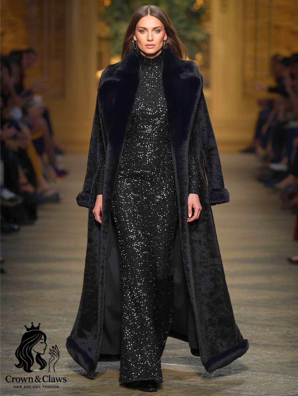 5. Black Sequin Turtleneck Gown with Floor-Length Fur Coat