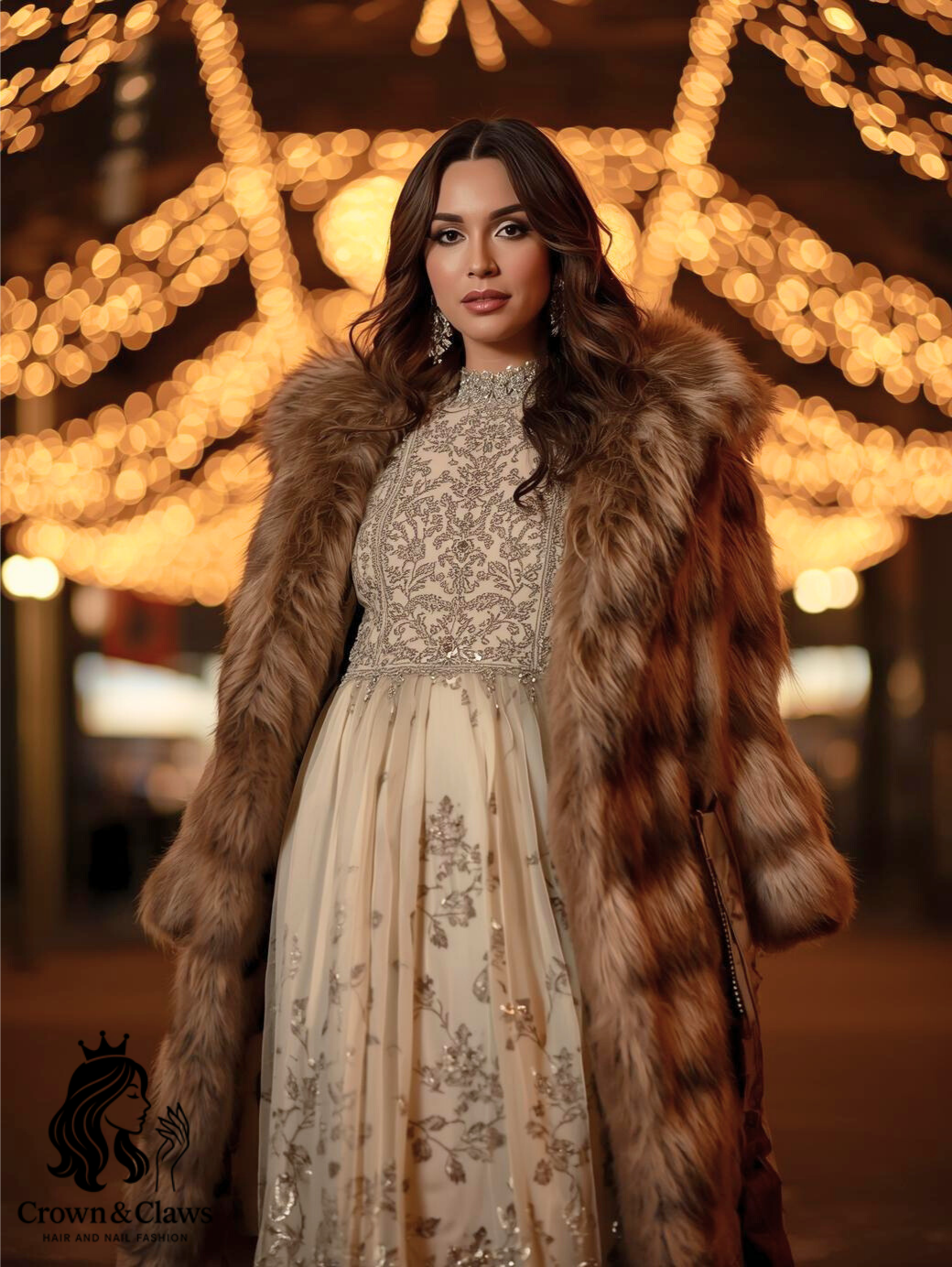 3. Cream Embellished Maxi Dress with Full-Length Fur Coat